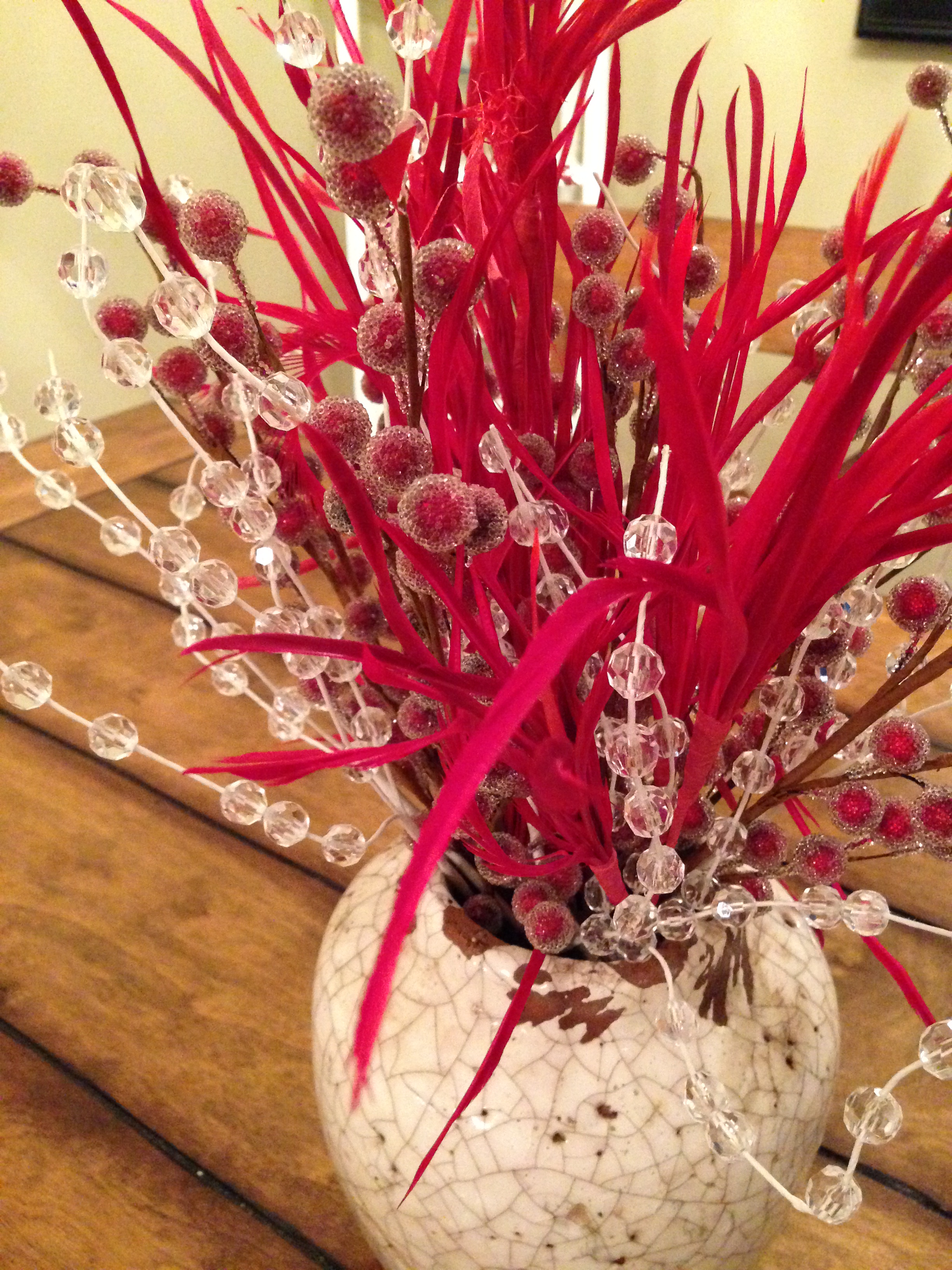 Then I bought a ton of the floral stems in red, pearl and white ($.75 each during Christmas season), as well as a few feathers ($1.50 each during Christmas season). {I bought so many that I ended up having enough to put on my kitchen table in a pot from Anthropologie that I love!}