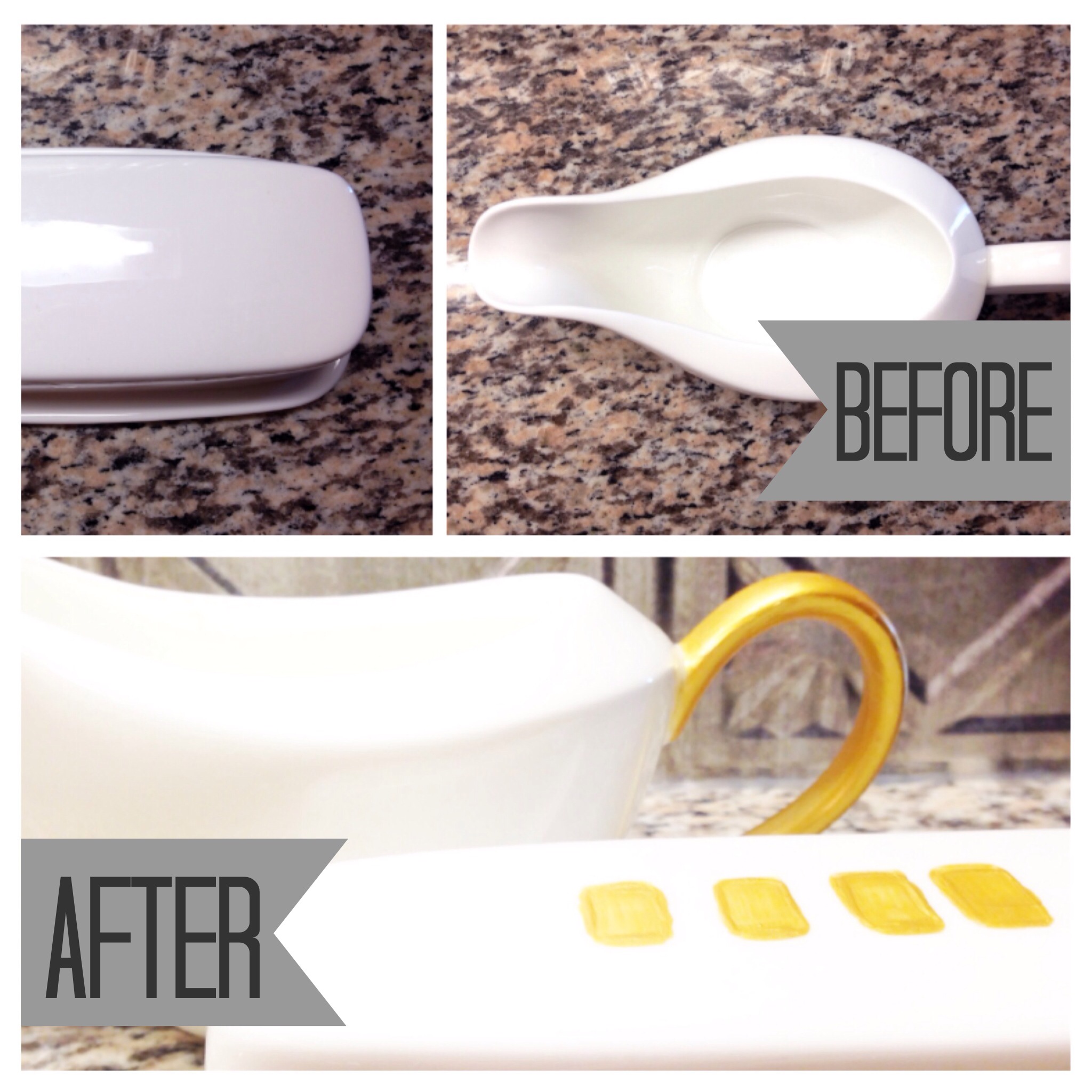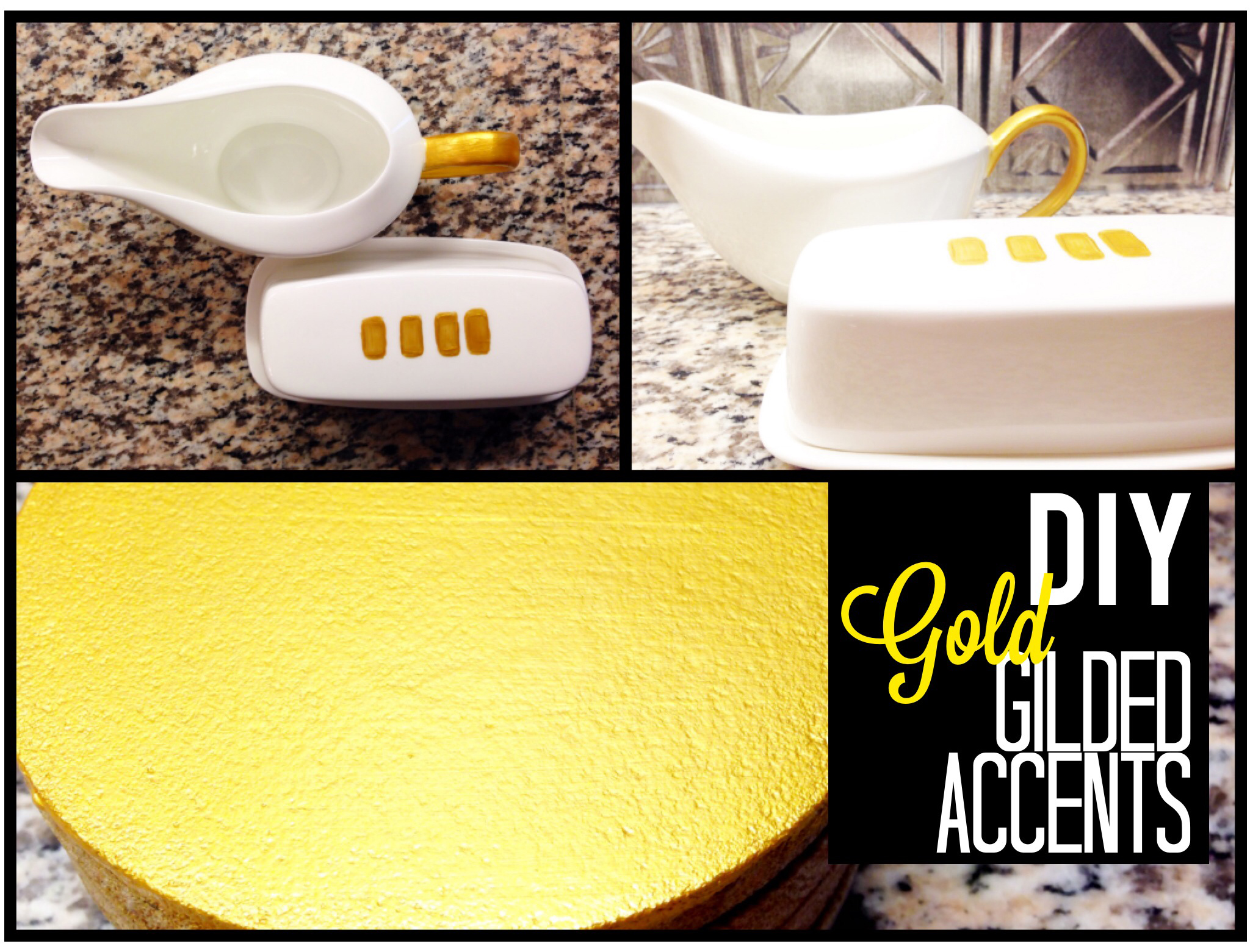 But I didn’t stop there! I have some plain white dishware and decided to put the gold gilded look to a gravy boat and butter dish that I use for festive holidays. These took 3-4 coats as well, but again because the paint dries quickly it didn’t take me any time at all to take these beauties from plain-Jane to glam-tastic!