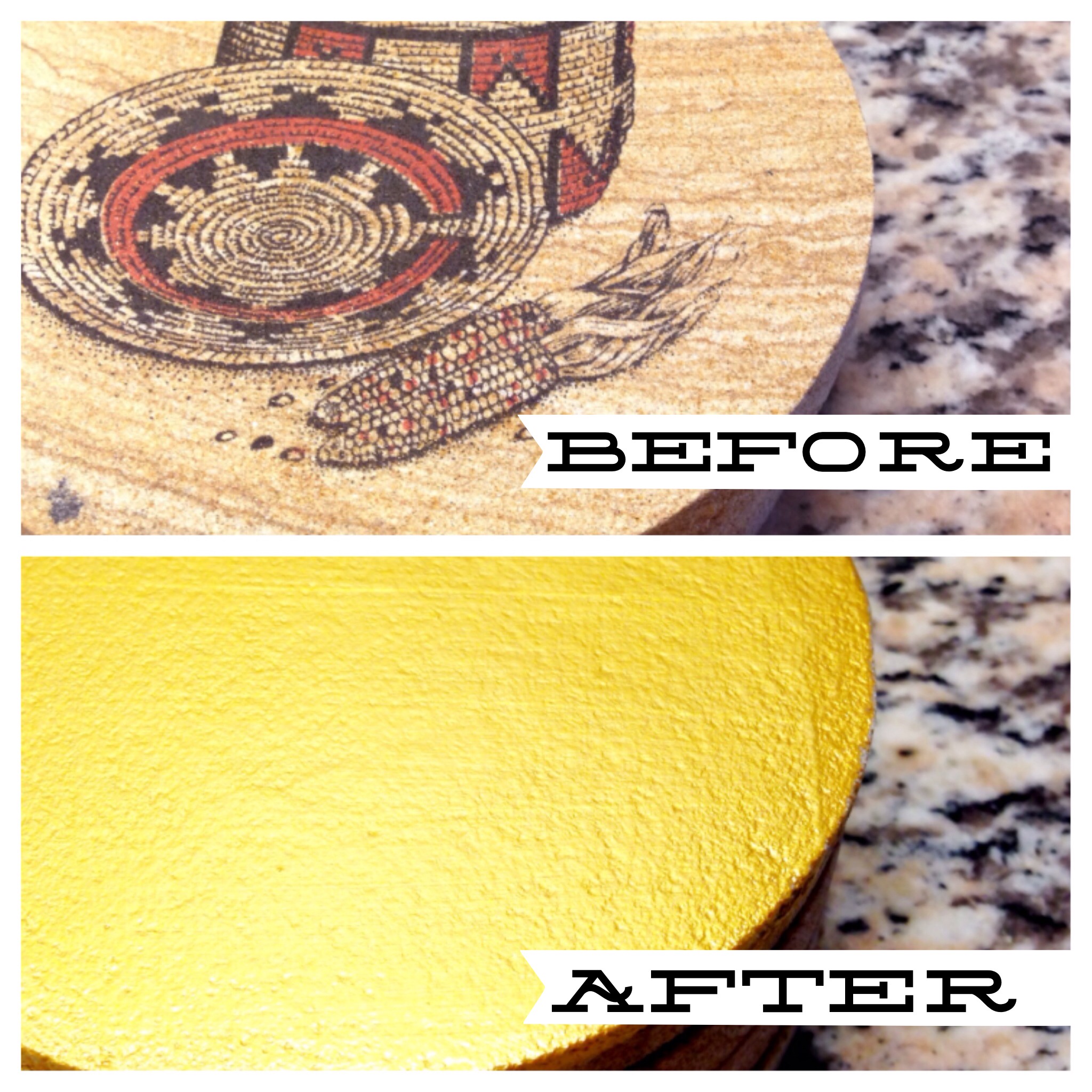Turns out I love the look of it! I grabbed some coasters I found at Goodwill for $2. They had a basket and some corn on them, which isn’t quite the style I was going for. ;) I used a thicker paint brush for these since they didn’t require as much detailed painting. It took 3-4 coats, but this paint dries super fast so it only took about 30 minutes to complete them. And, the gold gilding is really an improvement!