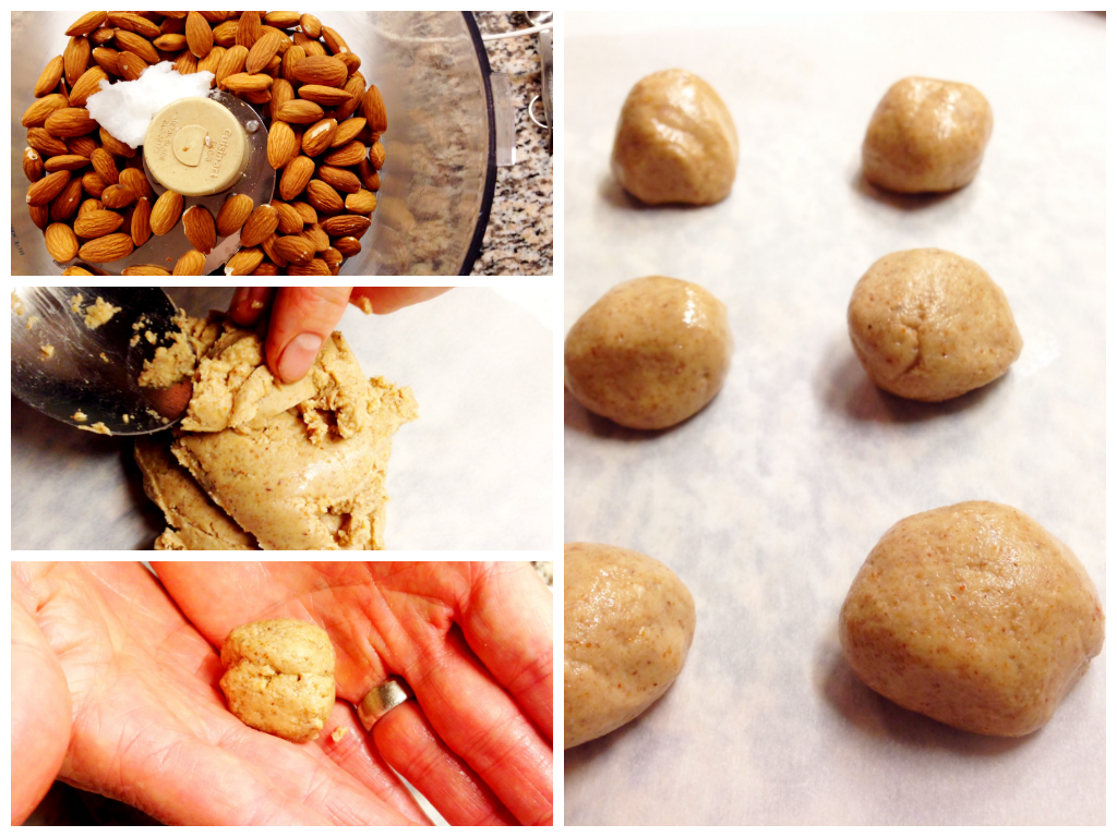 - Begin making balls with the almond butter paste. You should end up with 12 balls. Then flatten each of the almond butter balls.
