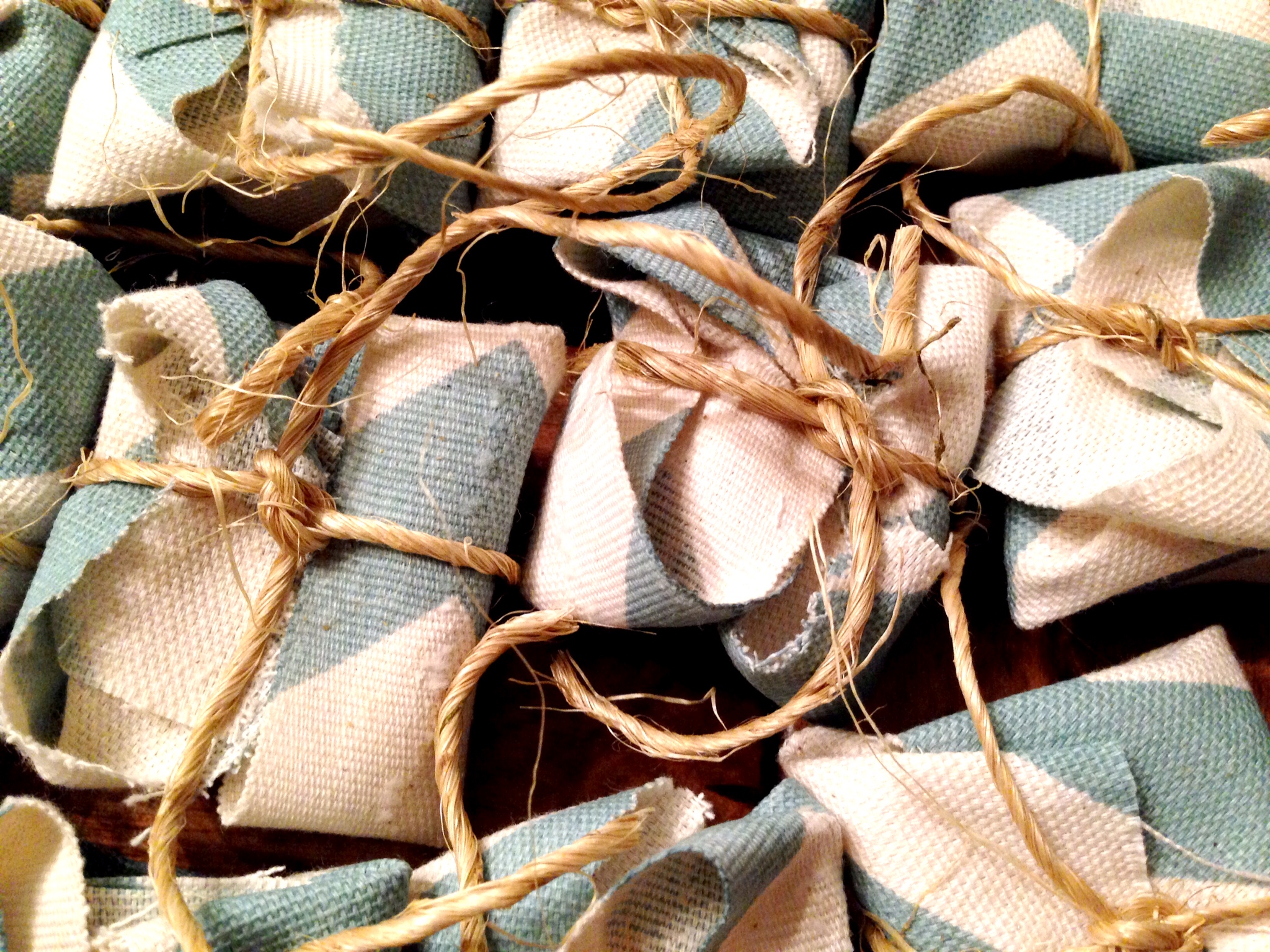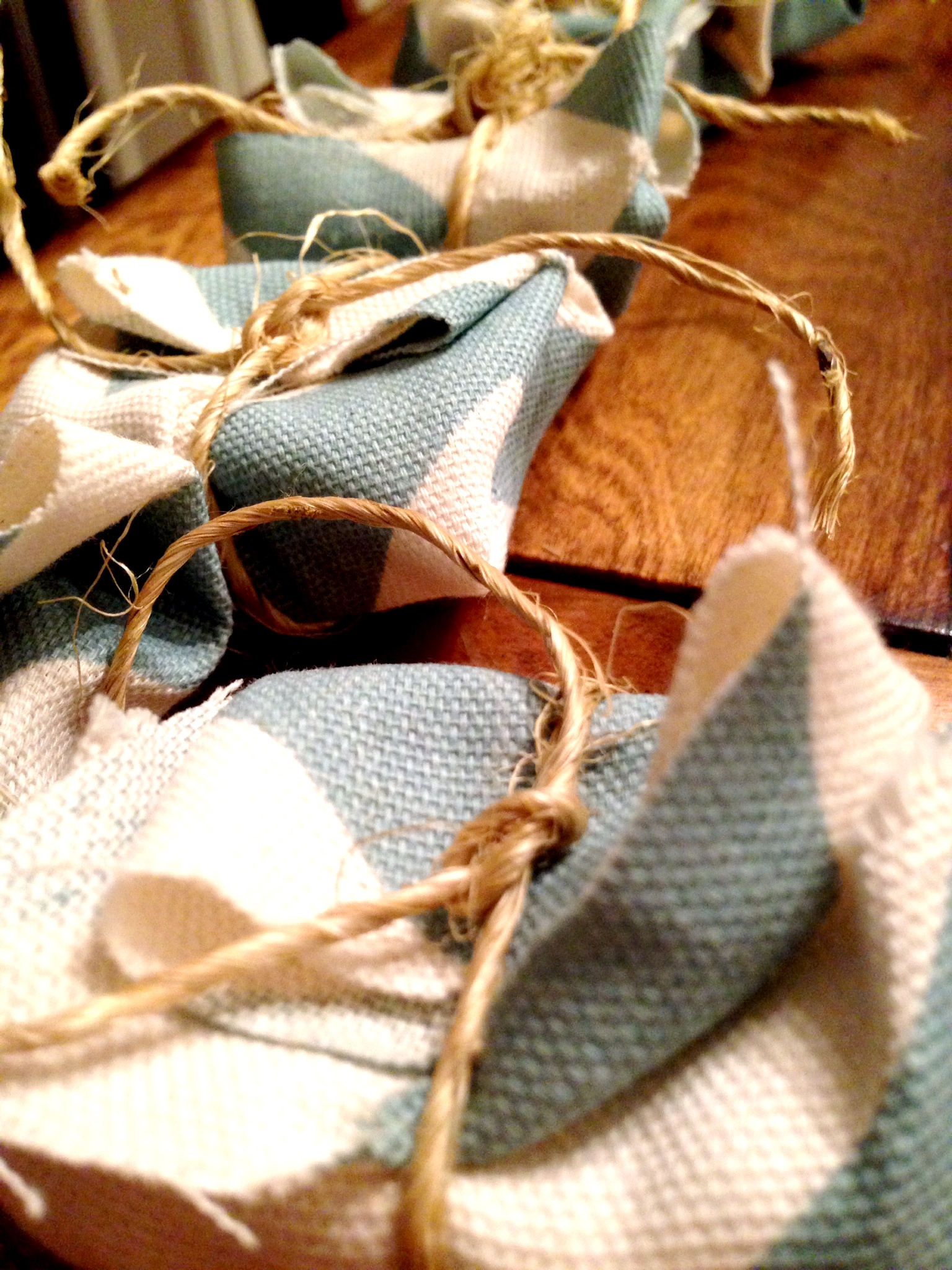 To begin, I simply took the tealight, wrapped it up in the fabric and then tied it securely with the jute string. Presto! A super cute, majorly easy shower gift for all to enjoy. We put them on each place setting and it really added to the decor as well.