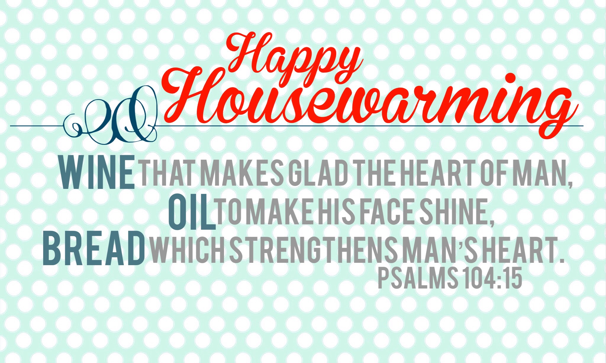Recently as I was reading through Psalms, I came across this passage in Psalm 104:15 that says, “And wine that makes glad the heart of a man, oil to make his face shine, and bread which strengthens a man’s heart.” I’ve been searching for the perfect, meaningful gift to give all of these friends who are becoming new home owners, and after reading this verse I thought, “That’s it!” What a lovely gift it will make to wrap up a bottle of wine (or sparkling cider for those who don’t drink wine), a bottle of olive oil and a fresh baked loaf of bread, all tied up with this scripture!