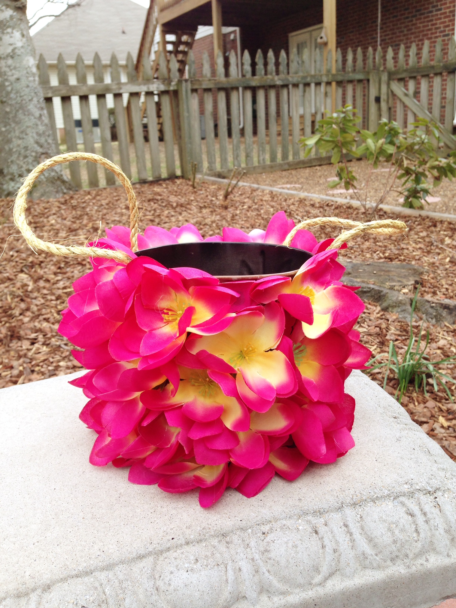Last, for my basket I bought a metal bucket and a bouquet of faux flowers, both from the Dollar Tree (just $1.00 each!). I started by pulling the flower heads off of the bouquets and cutting the stem so that the flowers would lie flat against the bucket. I whipped out the hot glue gun and got to glueing.