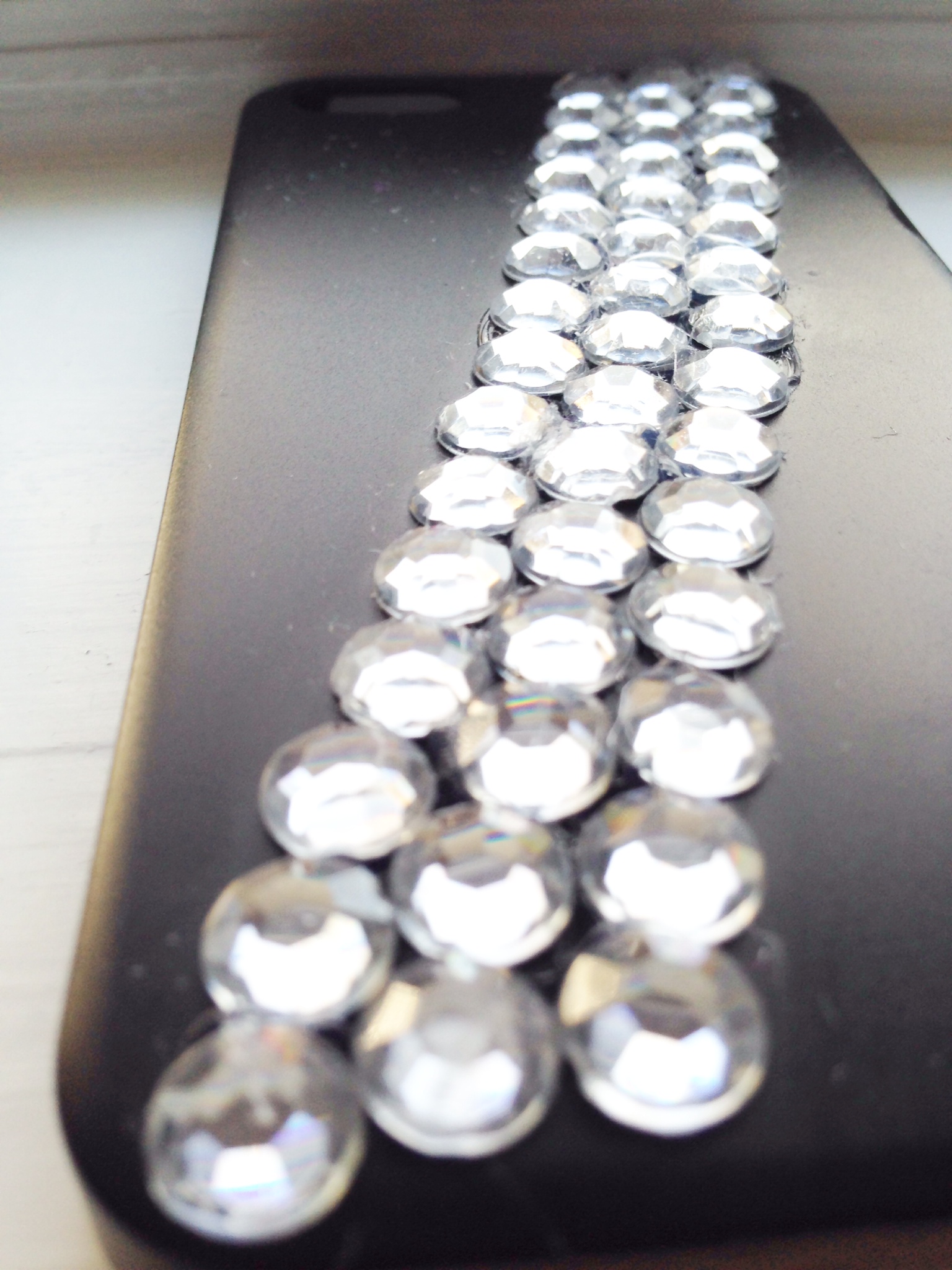 My cell phone case recently started falling apart a bit, so I grabbed a plain black iPhone case and a package of sparkly rhinestones (yep, both for just $1) and got to creating.