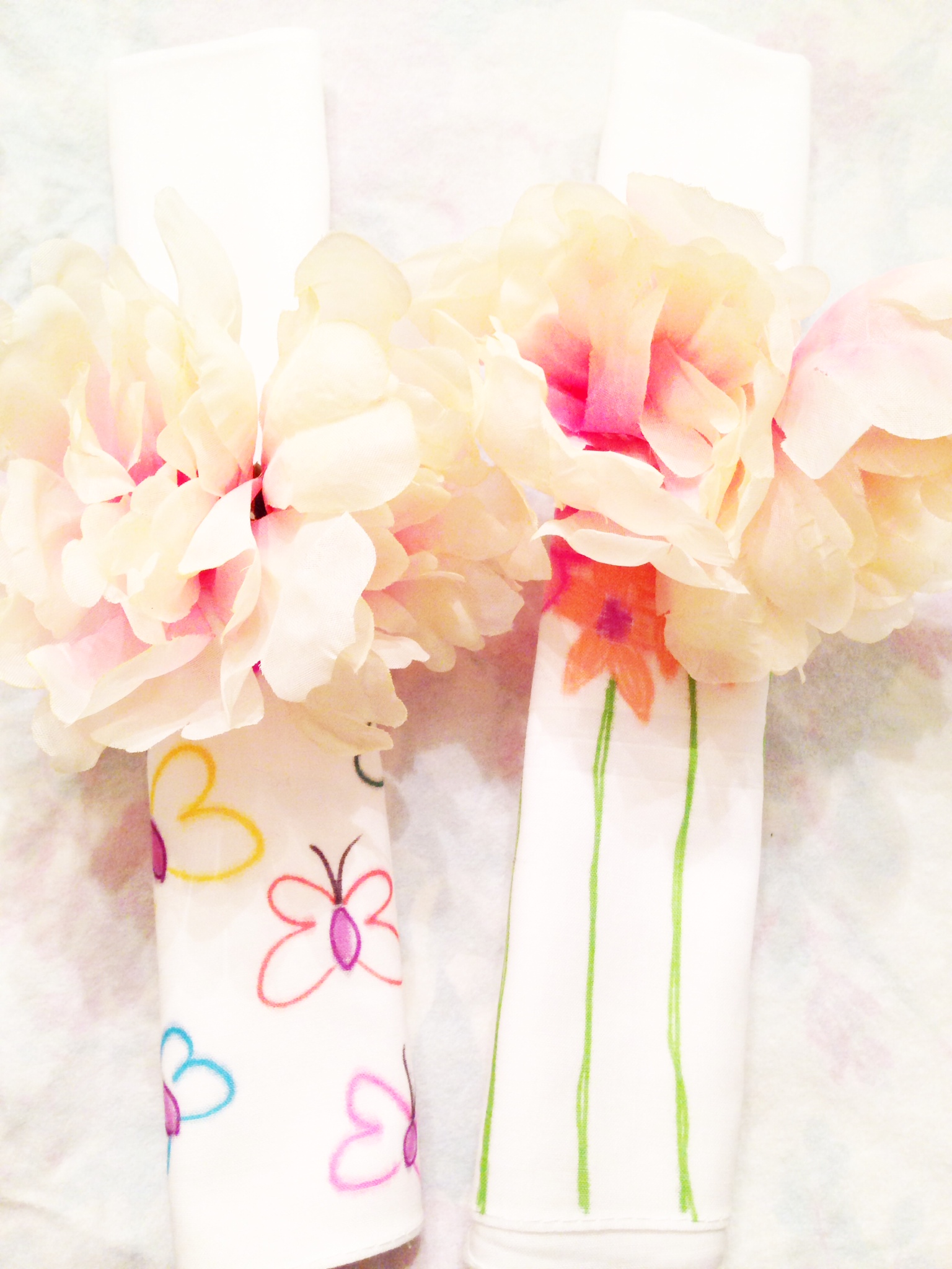 First, I purchased some “napkins” (they’re really just plain white handkerchiefs, similar to what I used for the Easter dish towels I told you about last week). They were just $0.99 a piece… score! Did you know that if you use permanent marker on fabric and then stick it in the dryer for 30 minutes or so on low that it will keep the marker from washing out (wash on gentle cycle, gentle soap, cold water)? Well, it’s true! That’s what I did for these Easter napkins.