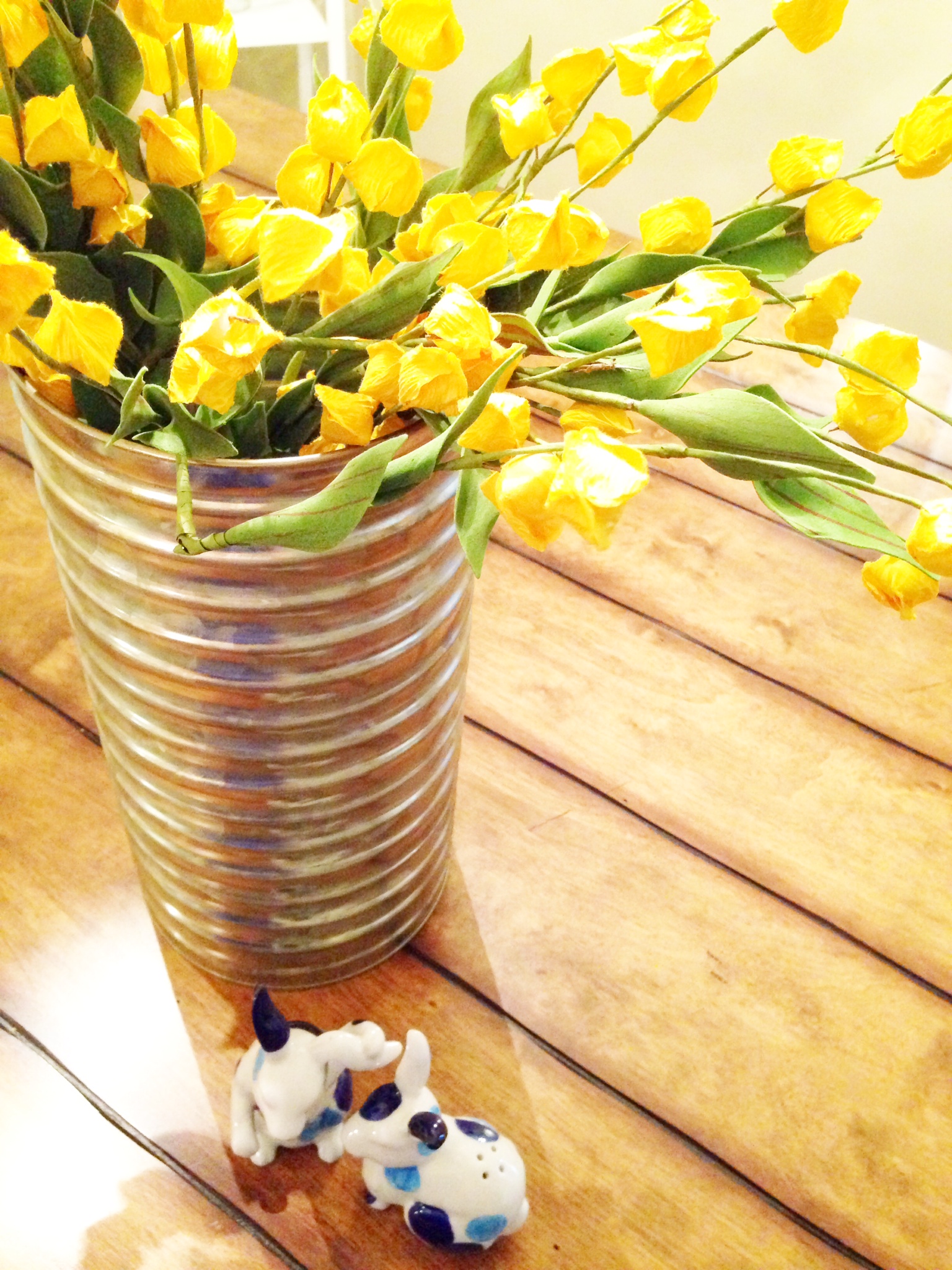 I got the vase and flowers from The Hob for just $20 total (2 stems of paper flowers for $5 a piece, vase for $10). The salt and pepper shakers (aren’t they adorable?!?!) are from Anthropologie. My husband bought them for me at Christmas. What a guy!