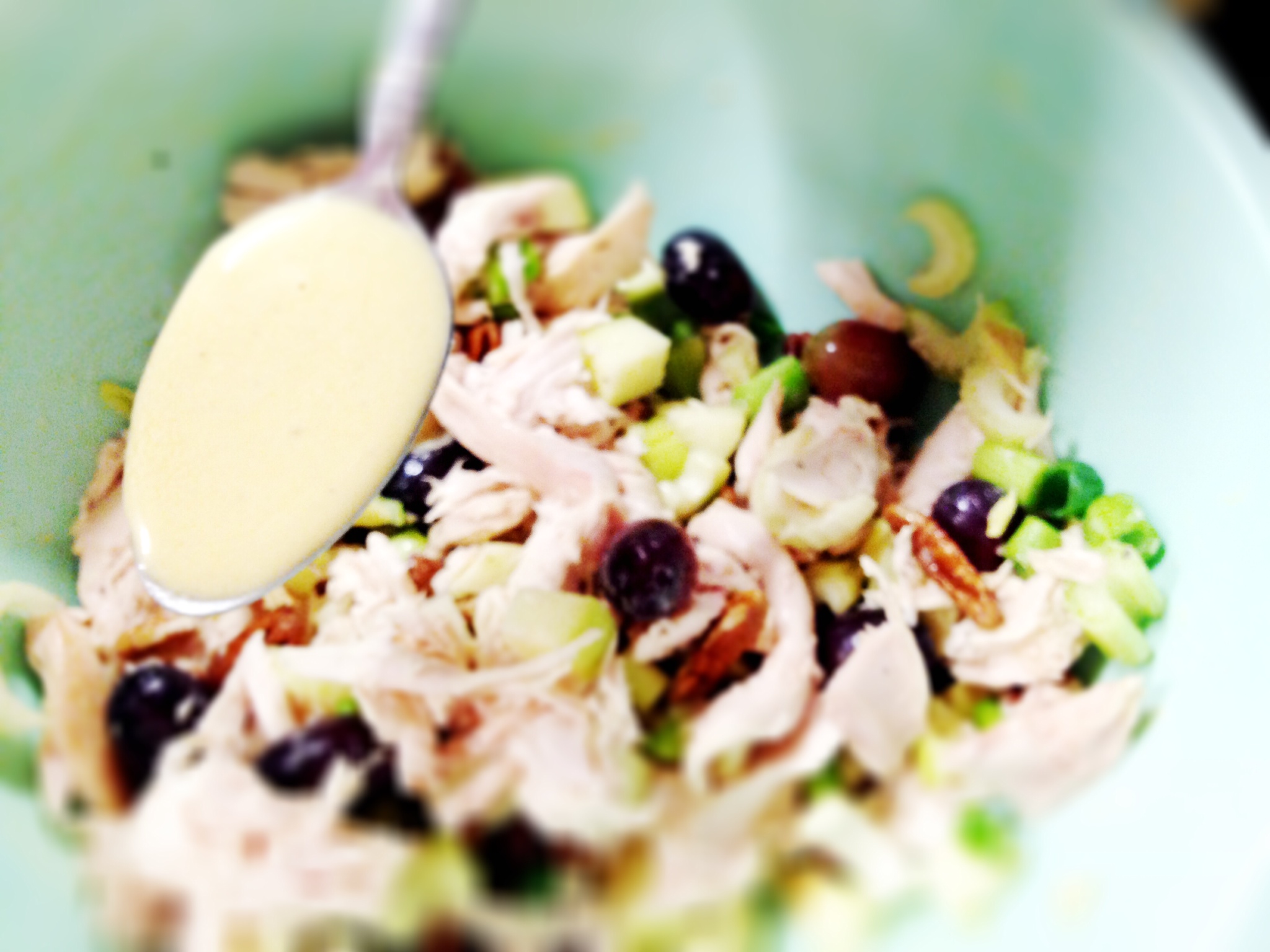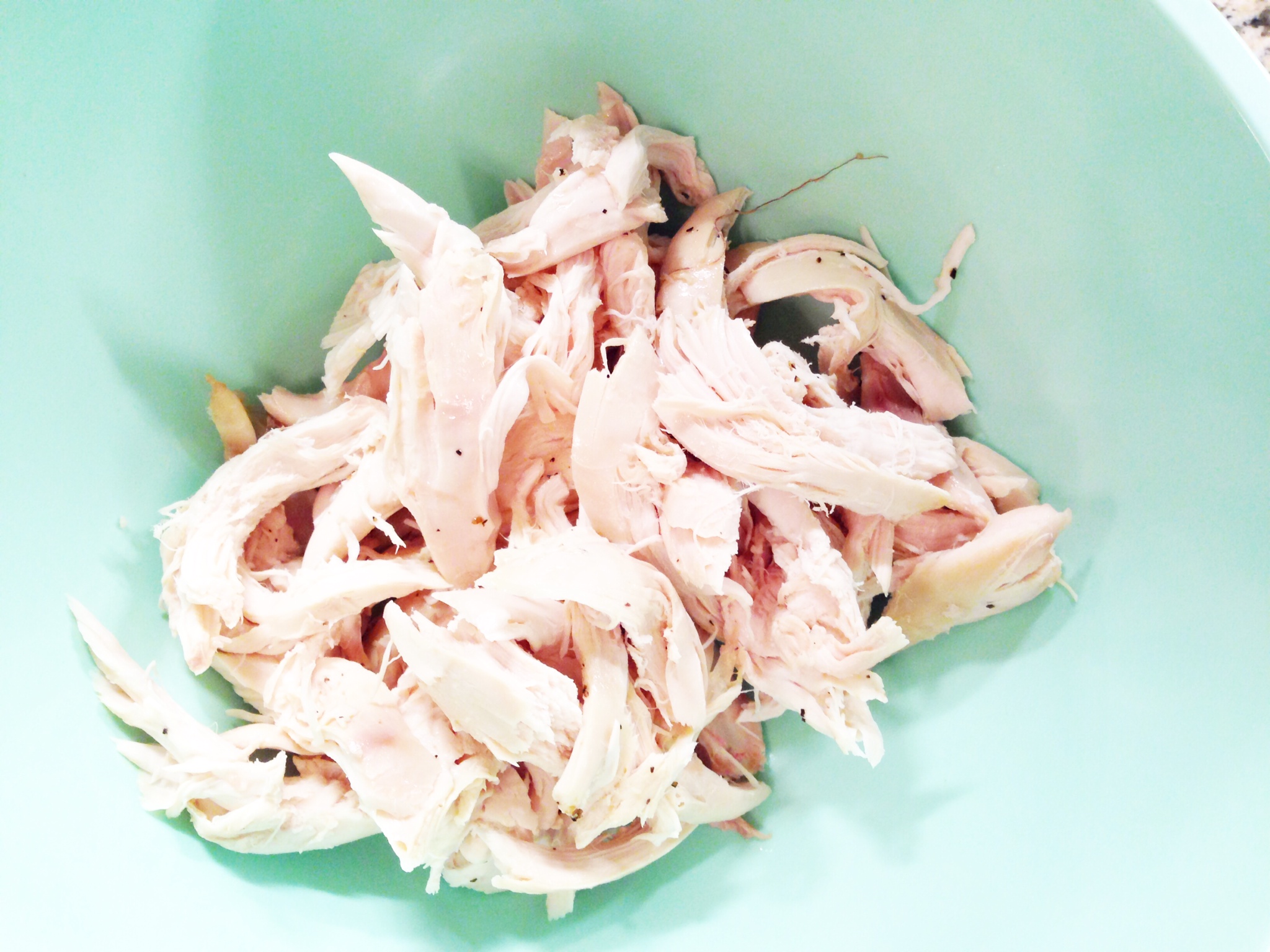 After shredding the chicken, throw all of the ingredients into a bowl and drizzle the baconnaise on top, then mix it up with your hands or a spoon.