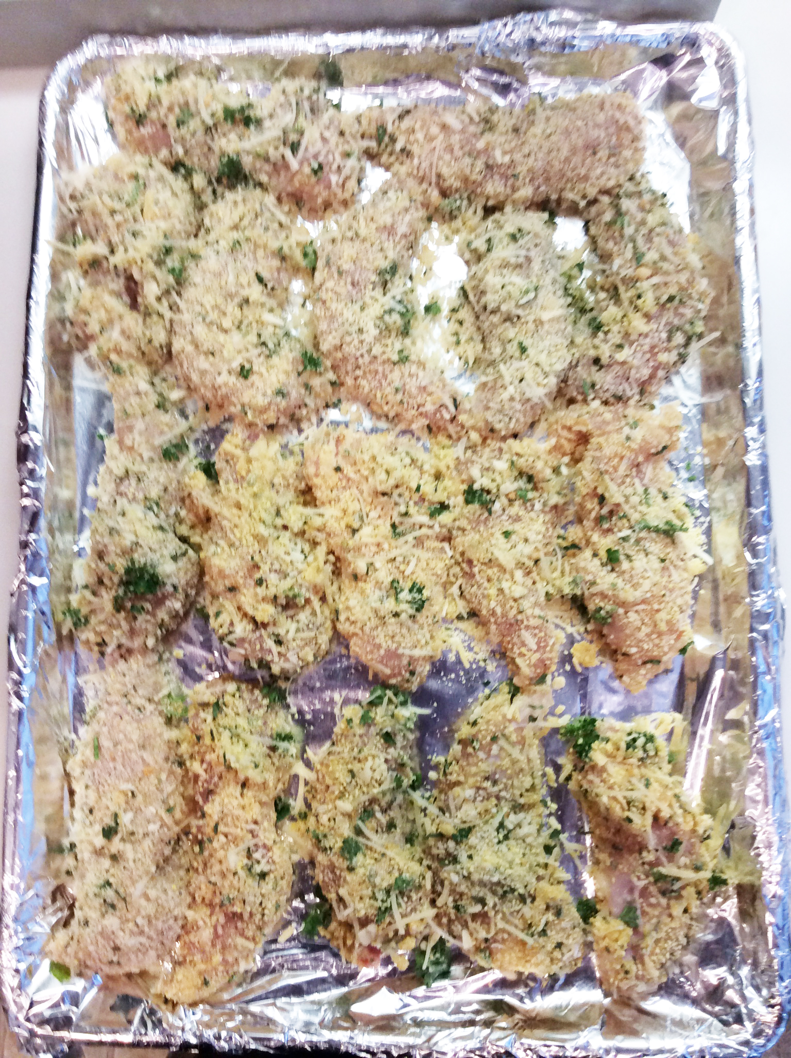 Put coated chicken onto a well greased pan, or a pan with tin foil (also greased). Stick it in a pre-heated oven at 350 degrees and bake for 25-30 minutes, or until golden brown.