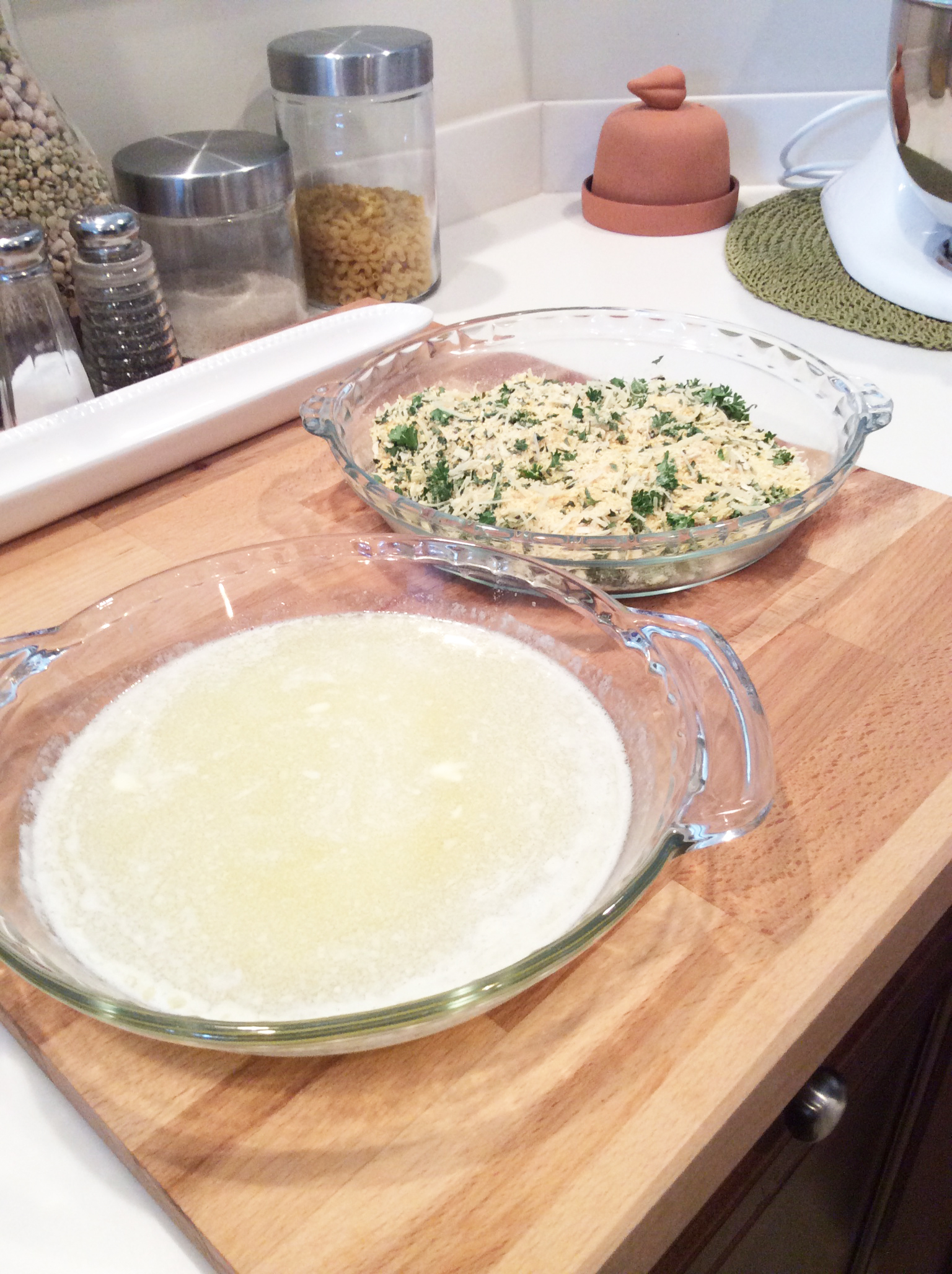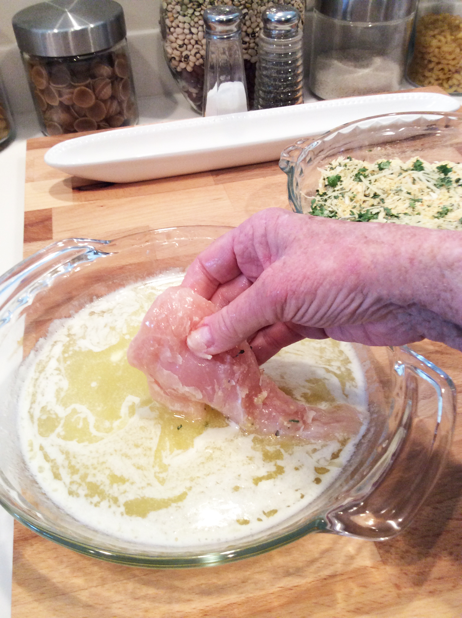 Dredge the chicken in the melted butter first, then in the dry ingredients mix (both sides).