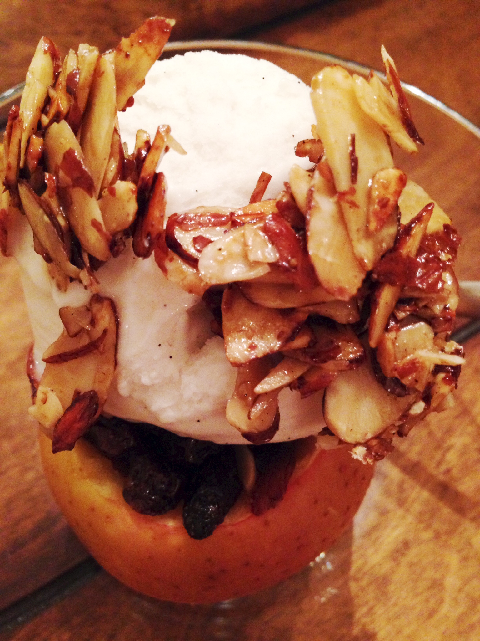 While the apples are baking, take the remaining slivered almonds and throw them in a pan on the stove with 1 tblsp of the coconut sugar and 1 tblsp of water to glaze the almonds. This will be your topping. Once the apples are baked, pull them out of the oven and let them cool for 5 minutes. Put them in a bowl with a scoop of vanilla coconut milk ice cream (or ice cream of your choice!), top with the glazed almonds and eat it up!