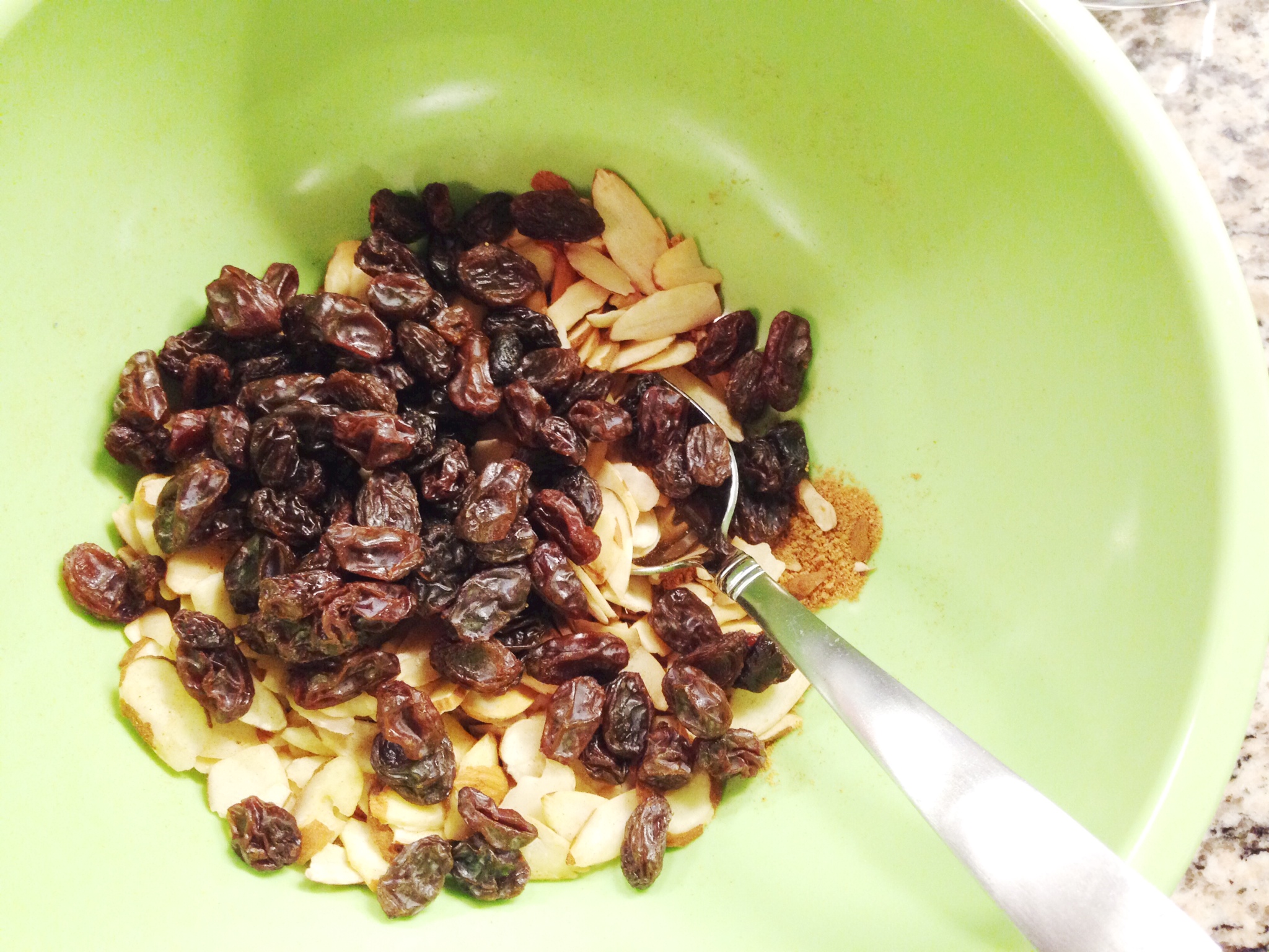 Next, mix 3/4 cups of the slivered almonds (save the other 1/4 cup for later), 1/2 cup of apple juice (save the other 1/2 cup for later), raisins, coconut sugar, cinnamon and nutmeg. Make sure the raisins and almonds are coated well with the other ingredients.