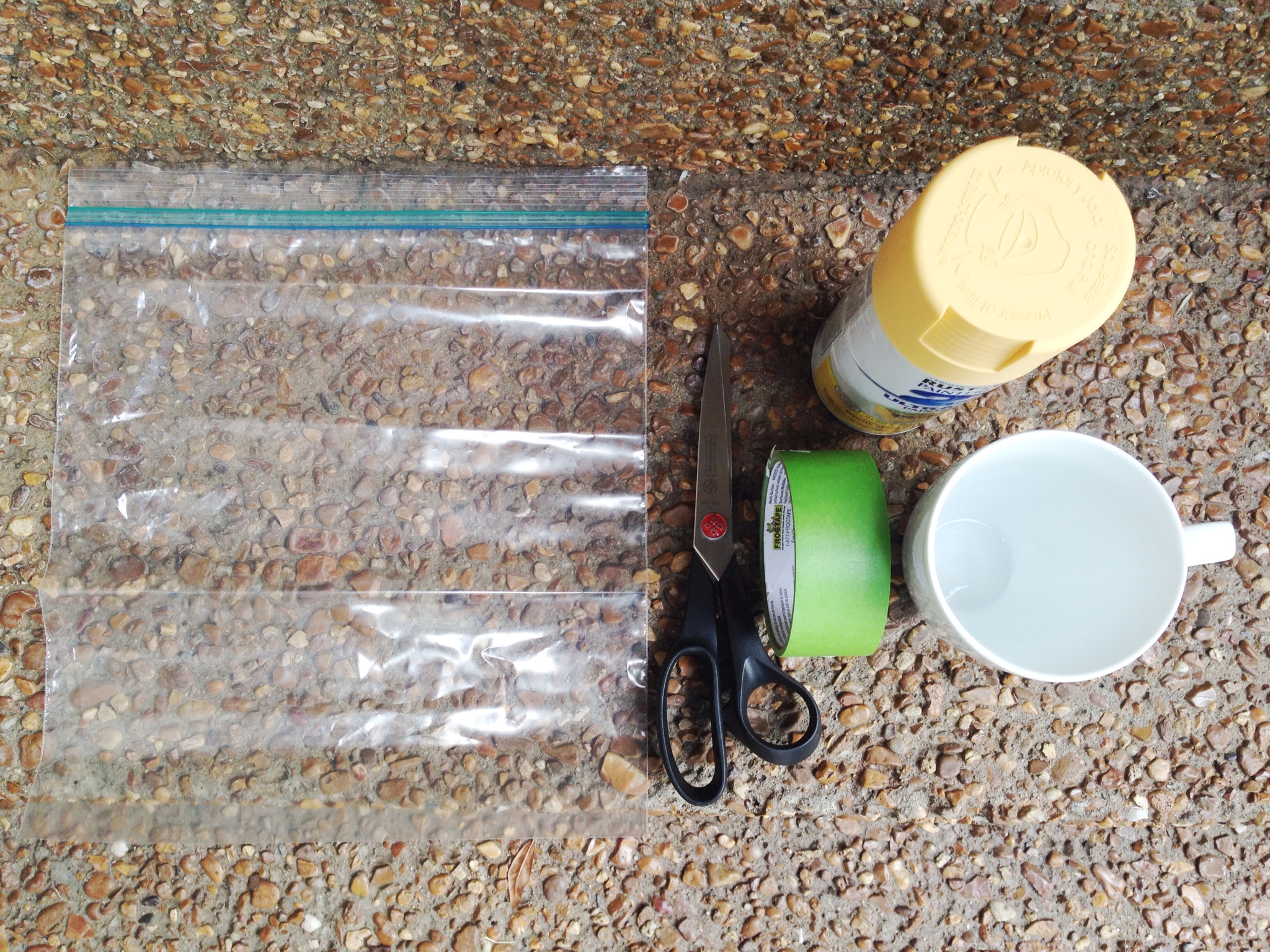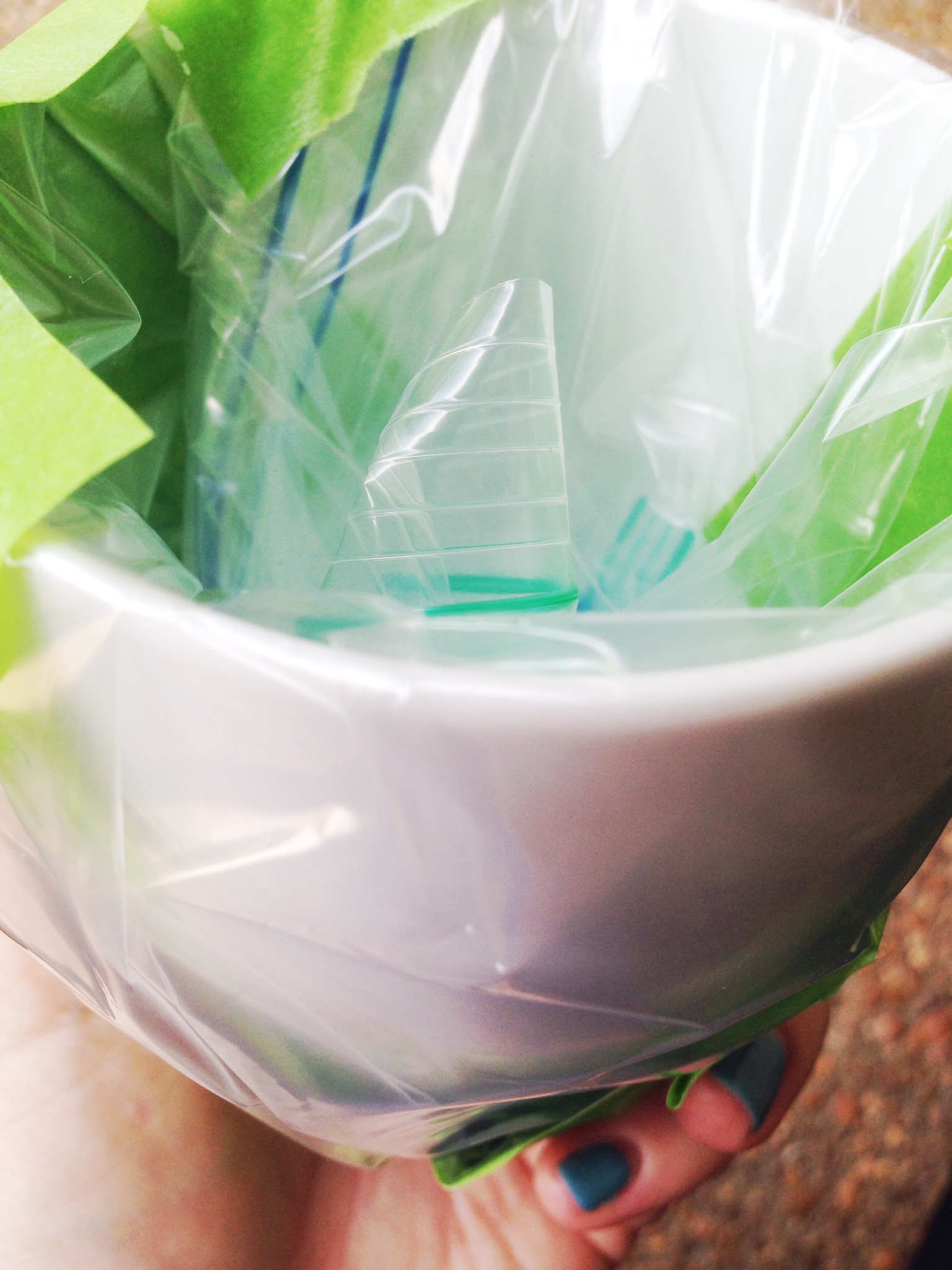 Then, I had to cover the portions that I didn’t want to spray paint. I used a zip lock bag cut in half and taped up the mug to cover the portions I wanted to remain white.