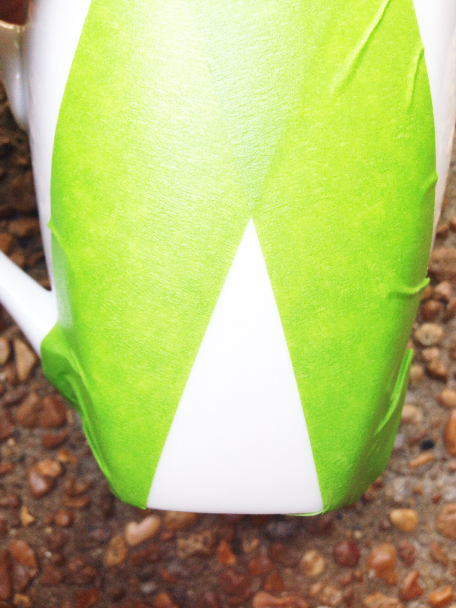 There are seriously so many possibilities when it comes to spray paint. Never underestimate the transformation those little cans of colored mist can do! I was recently sent a pin on Pinterest that inspired me to take a few minutes to create my own geo-styled coffee mug. Here’s the original inspiration, thanks to our adult daughter, Macey: