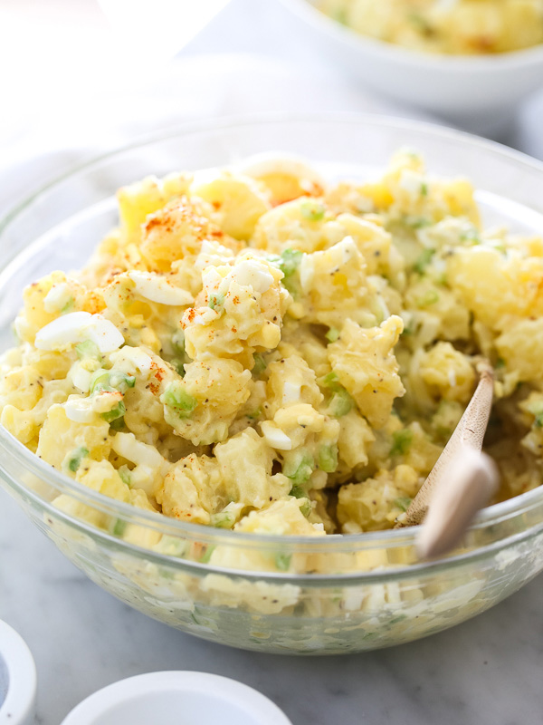 I came across this recipe and adapted it for our eating style. It’s seriously delicious! And, I was elated when my dad, who is basically a potato salad eating aficionado, said he loved it, too. Potato salad for the win!